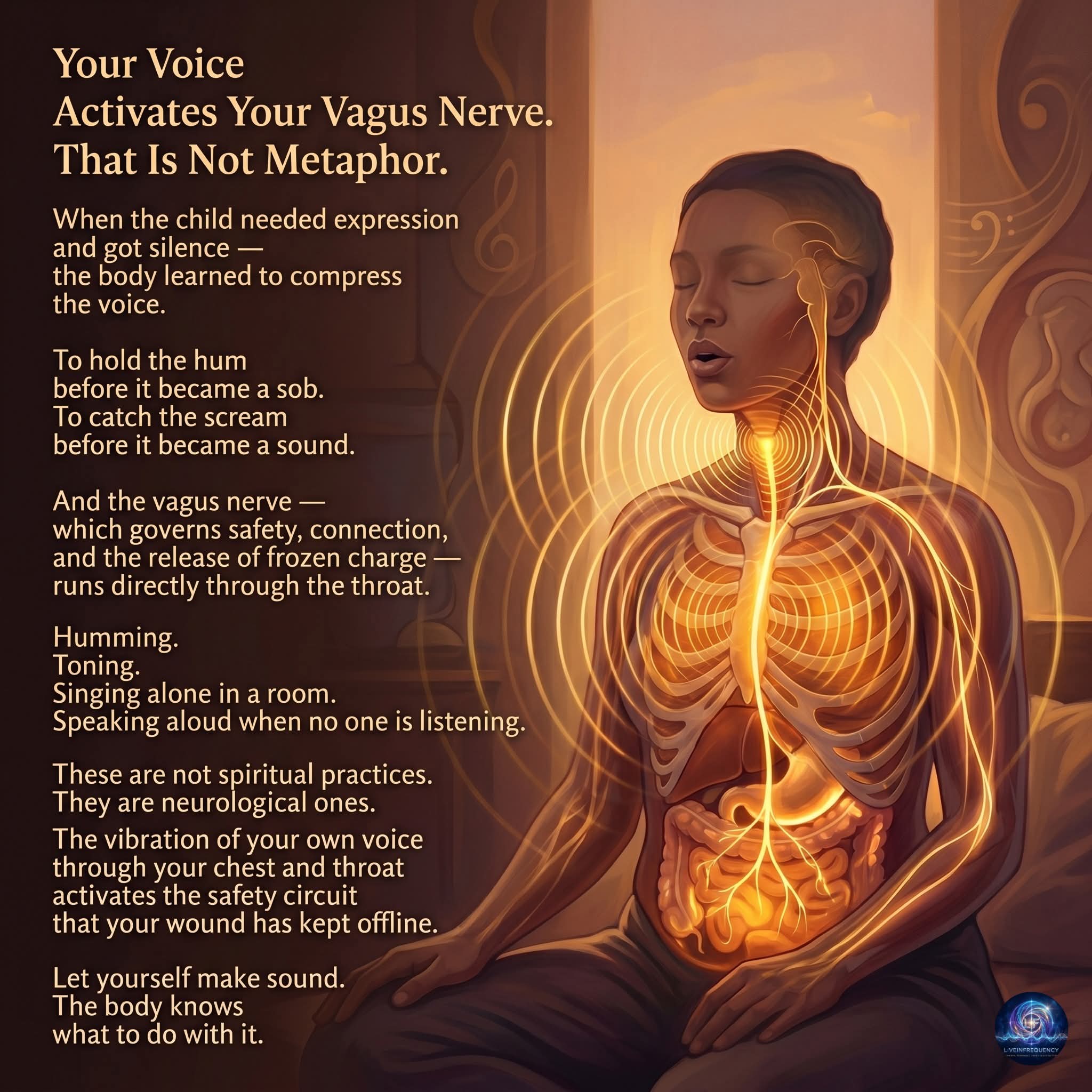 Particularly we refer to the solar plexus, or celiac plexus. This is a large part of the Sympathetic Nervous System. Known world-wide by medicine, science and spiritual people as the centre of fear, hurt and stress. Solar plexus affects every organ of the body, including the skin, our biggest organ. Calming of solar plexus by use of just voice brings about huge favorable changes to the whole body.